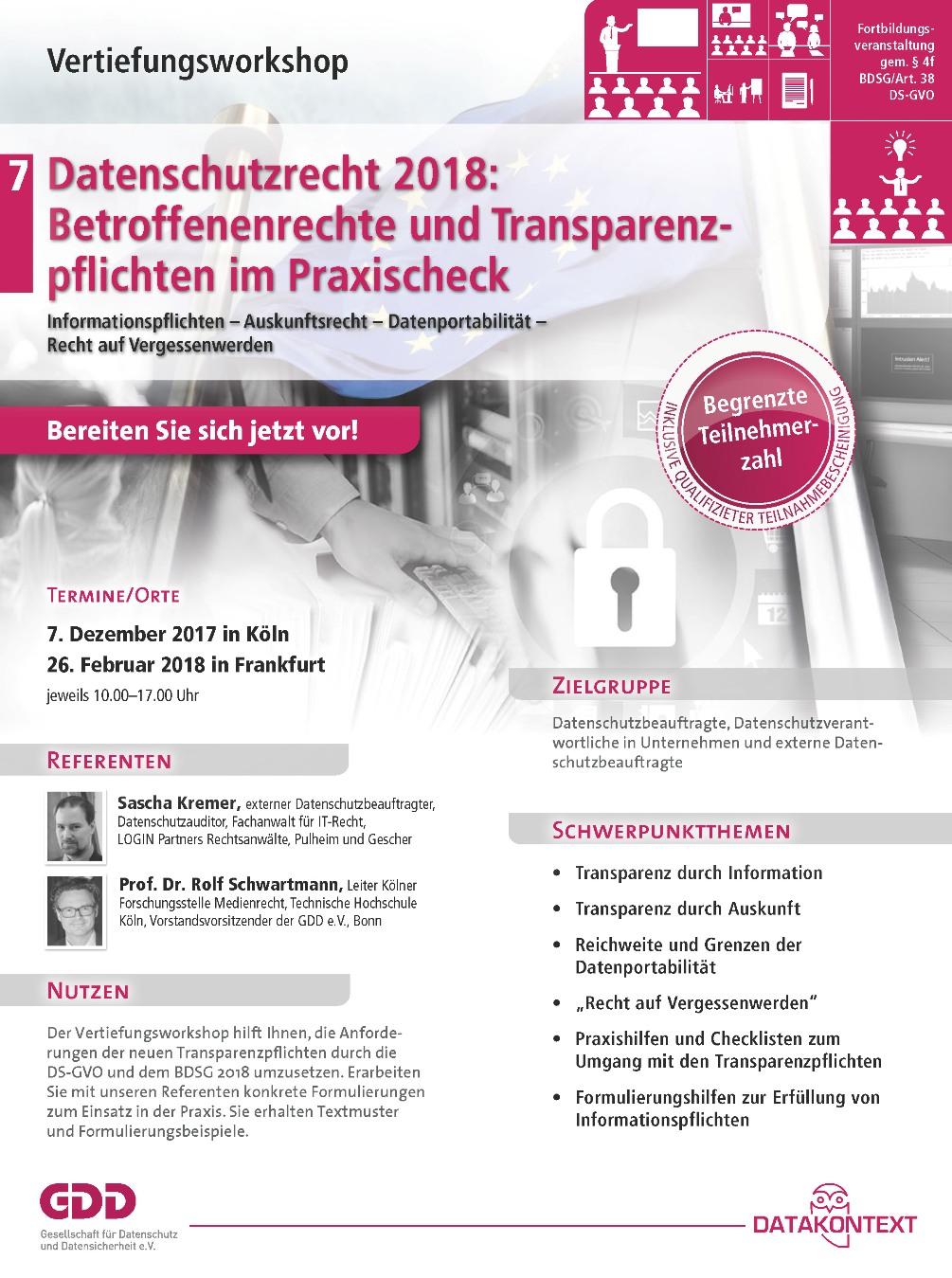 Am 7. Dezember 2017 findet der gemeinsam mit der Datakontext veranstaltete Vertiefungsworkshop „Betroffenenrechte und Transparenzpflichten im Praxischeck“ in Köln statt. Unser auf IT- und Datenschutzrecht spezialisierte Partner Sascha Kremer wird diesen Workshop gemeinsam mit Prof. Dr. Rolf Schwartmann, Leiter der Kölner Forschungsstelle für Medienrecht und Lehrstuhlinhaber an der Technischen Hochschule Köln, leiten.