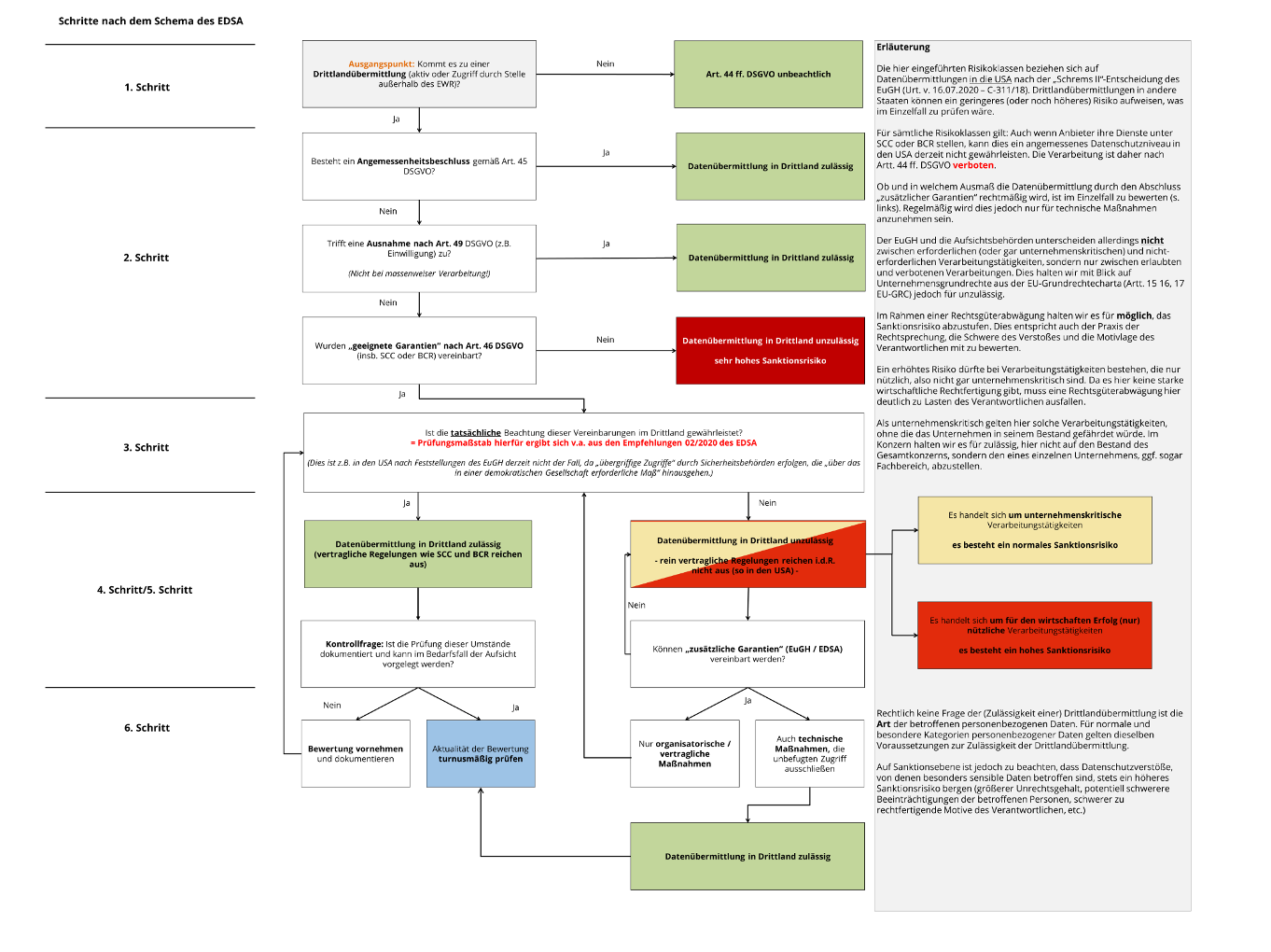 - Die Rechtslage im Drittland verhindert bezogen auf die konkreten Umstände der Verarbeitung ein angemessenes Datenschutzniveau, etwa weil der Datenimporteur die vertraglichen Pflichten aus den SCC wegen der für ihn geltenden Gesetze nicht einhalten kann (so vom EuGH im „Schrems II“ für viele Datenimporteure in den USA bereits festgestellt). Die Drittlandübermittlung ist in diesen Fällen nach dem EDSA nur rechtmäßig, wenn die weiteren Schritte eingehalten werden.