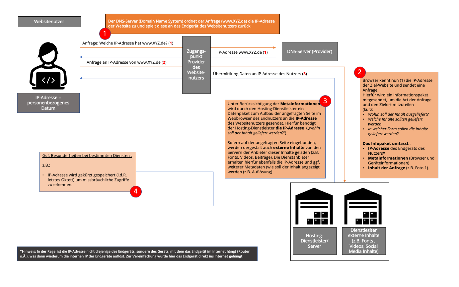 Sofern Fonts nicht auf eigenen Servern gehostet werden, führt die Nutzung von Font-Diensten zur Übermittlung von Verbindungsdaten der Nutzer (IP-Adresse) an die Server des jeweiligen Anbieters, siehe dazu das folgende Schaubild zur Übermittlung von Daten bei dem Aufruf von Websites (insb. Schritte 2 und 3):