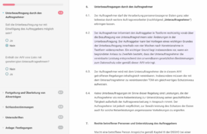 Der Nutzer wird dabei gebeten, Angaben zur Datenübermittlung und zum Verhältnis zum Vertragspartner zu machen. Zudem wird die Rollenverteilung zwischen den Beteiligten abgefragt, also ob es sich z.B. um eine Auftragsverarbeitung oder eine Verarbeitung als gemeinsam Verantwortliche handelt. Je nachdem, in welchen Ländern die Daten verarbeitet werden, ist die Absicherung über SDK und ein TIA erforderlich. Der Nutzer kann dabei auch aus dem Tool heraus eine E-Mail an den Dienstleister schicken lassen, um erforderliche Informationen von diesem direkt im Tool bereitstellen zu lassen.
