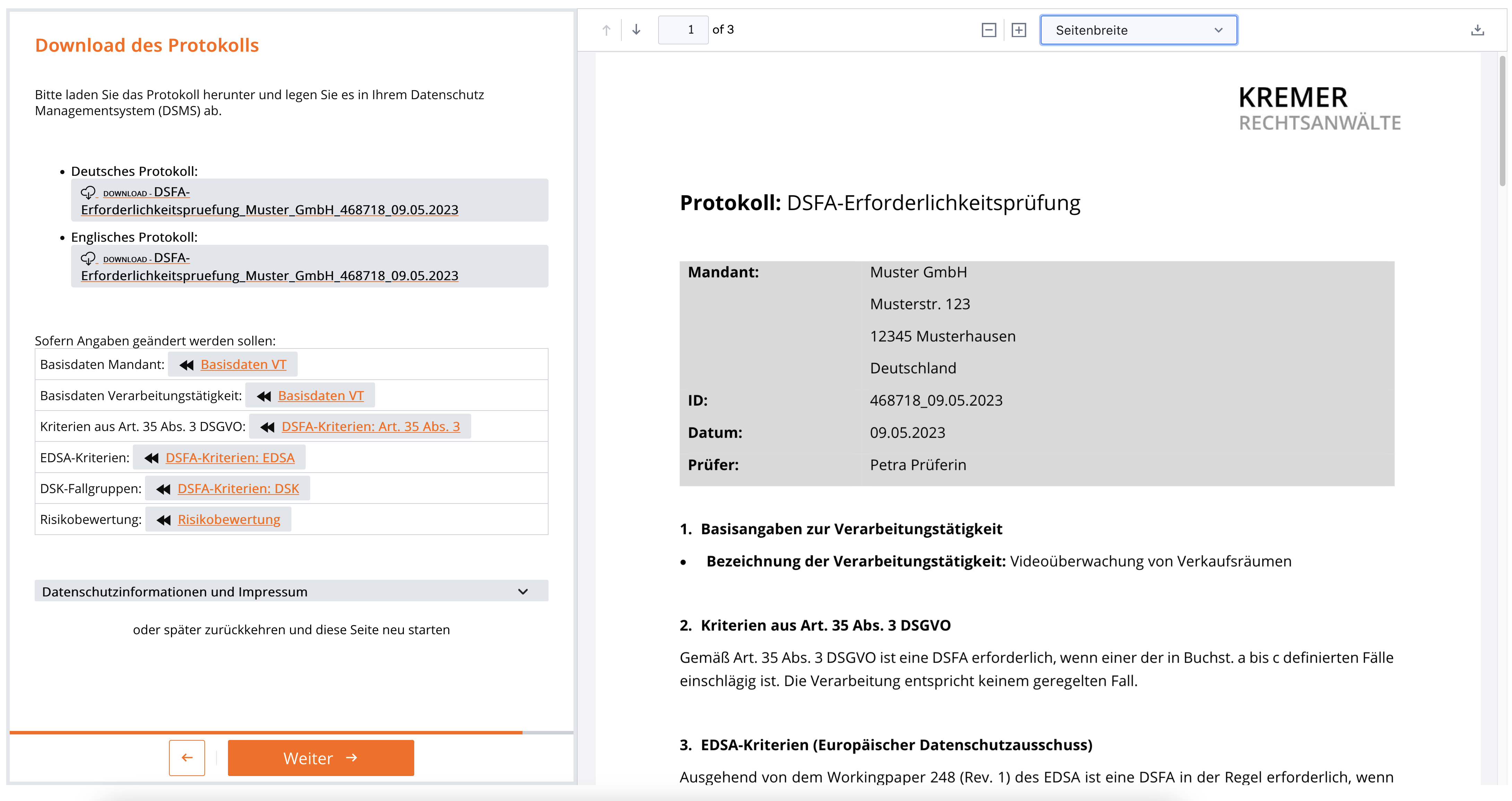- Sie erhalten nach jedem Schritt ein Protokoll für Ihr Datenschutzmanagementsystem