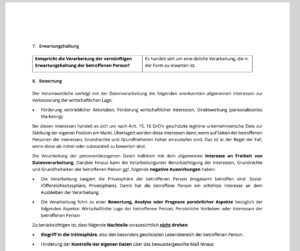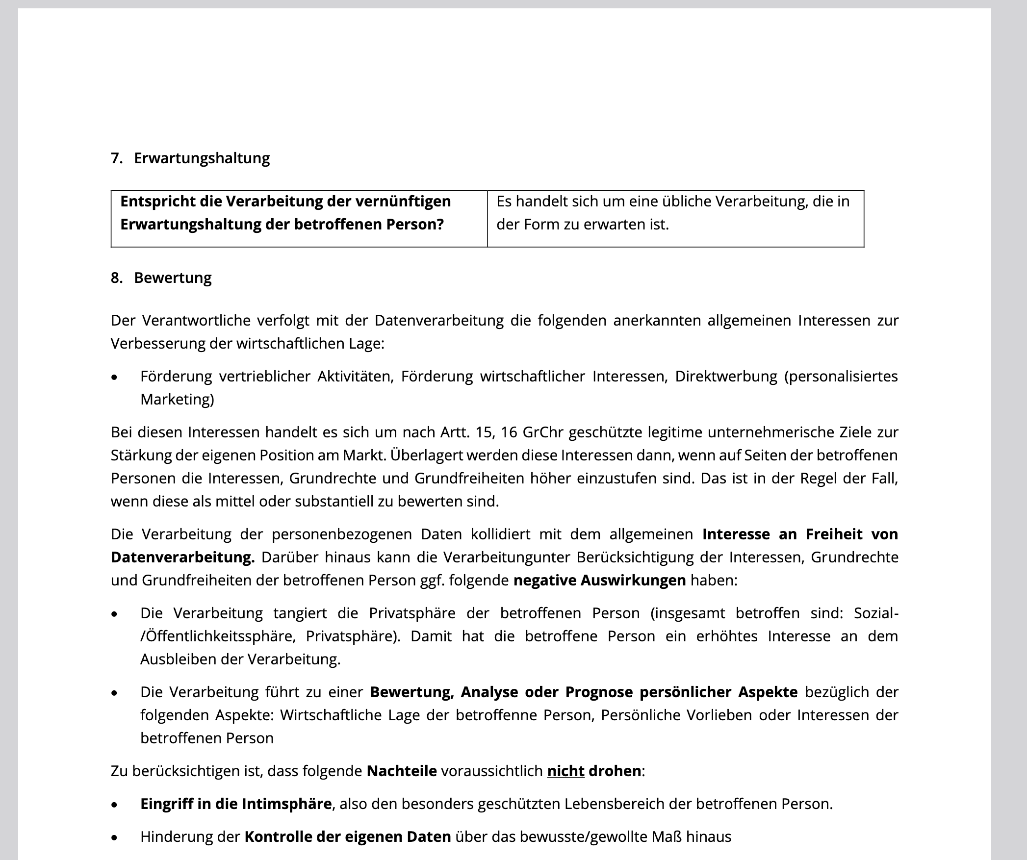 Im letzten Schritt wird dem Nutzer mitgeteilt, ob die Vorbewertung positiv oder negativ ausgefallen ist. Dabei wird dem Nutzer auch eine ausführliche Begründung des Ergebnisses bereitgestellt. Zum Schluss erhält der Nutzer ein Protokoll der Interessenabwägung zur Dokumentation der durchgeführten Interessenabwägung für sein Datenschutzmanagementsystem.
