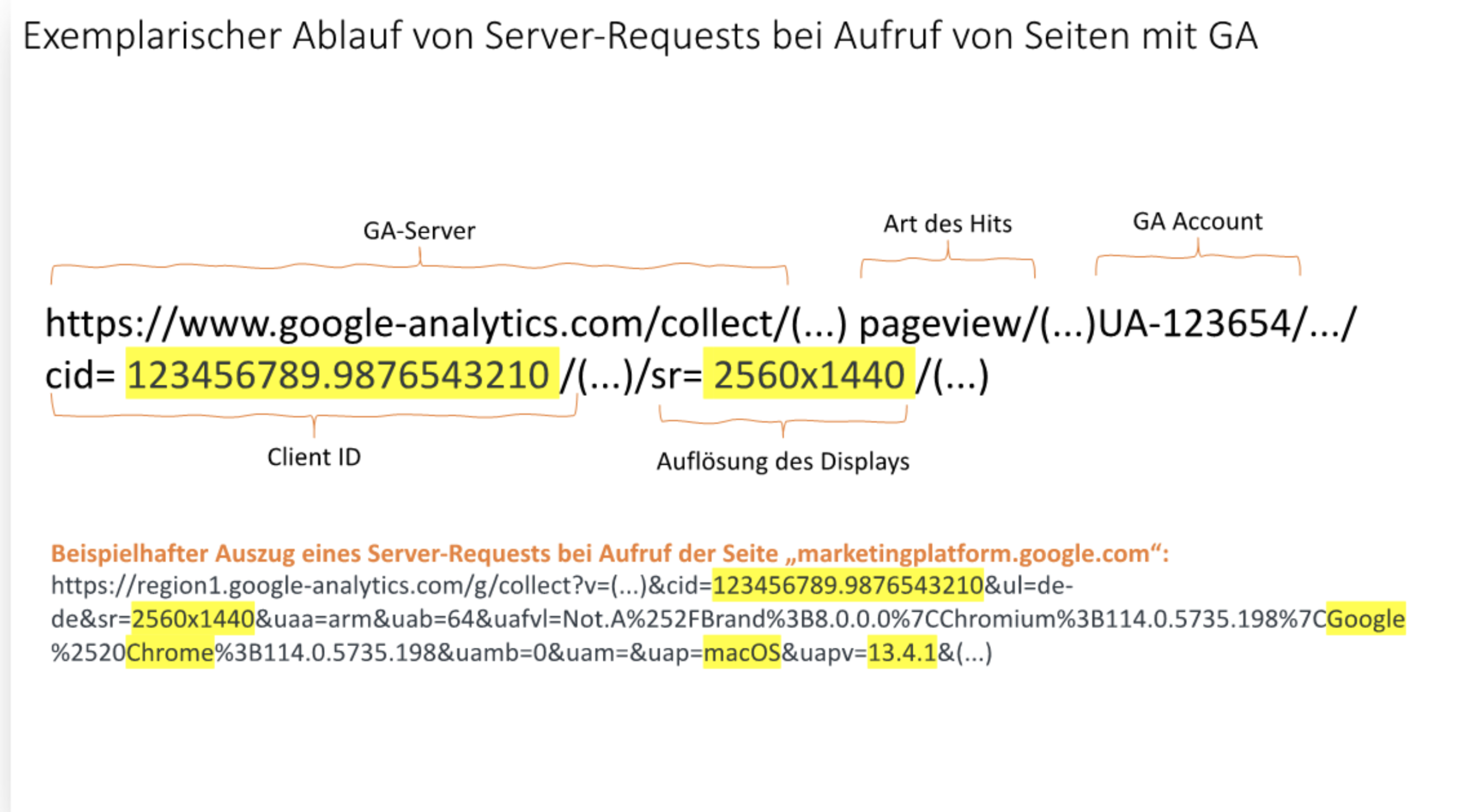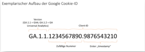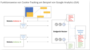 Cookie-Tracking bei Google Analytics: Willigt der Nutzer in den Einsatz von Google Analytics über das Consent-Tool ein, werden verschiedenen Google-Cookies mit einer eindeutigen Cookie-ID auf dem Endgerät gespeichert. Hierdurch kann das Endgerät des Nutzers wiedererkannt werden. Ausgehend von dieser ID kommt es zur Übertragung unterschiedlicher Daten an Google-Server, um das Nutzungsverhalten auszuwerten. Dies erfolgt über sog. Server-Requests. Auf den folgenden Schaubildern haben wir den Ablauf schematisch dargestellt:
