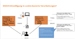Zeitlich benötigt der Webseitenbetreiber also zunächst die Einwilligung nach dem TTDSG für das Setzen der Cookies und darauf aufbauend für die anschließende Verarbeitung der personenbezogenen Daten die Einwilligung nach der DSGVO. Da die Datenverarbeitung aber in der Regel direkt mit dem Setzen des Cookies einhergeht, handelt es sich lediglich um eine juristische Sekunde zwischen dem Setzen des Cookies und der Verarbeitung. Daher muss die Einwilligung in der Praxis vor dem Setzen des Cookies über ein Cookie-Consent-Banner eingeholt werden. Diese Consent-Banner werden über eine Consent Management Platform (CMP) oder ein anderes Consent-Management-Tool („Consent-Tool“) eingeholt.