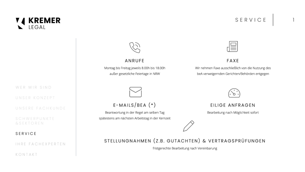 Im Übrigen waren Logo und Design, insbesondere unserer Website, nicht mehr zeitgemäß und standen nicht mehr für unsere Arbeitsweise. Wir arbeiten präzise, verständlich, strukturiert, aber stets mit klaren, überzeugenden, begründeten und hilfreichen Aussagen. Das sollte sich in geradlinigen, übersichtlichen und direkt zu erfassenden Logo und Design widerspiegeln.